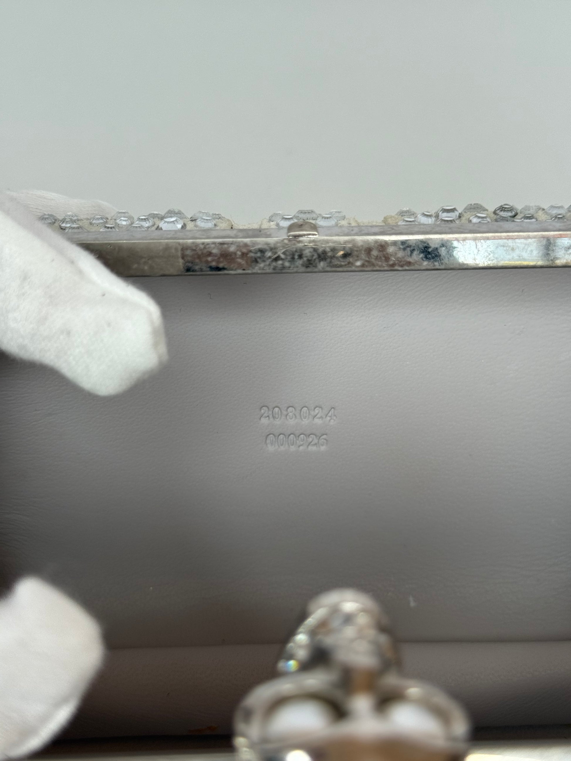 The Alexander McQueen White Suede Studded Britannia Skull Box Clutch is a chic, statement-making accessory crafted from soft white suede. Featuring stud embellishments and the iconic skull knuckle handle in silver-tone hardware, it adds edgy sophistication to any evening look.