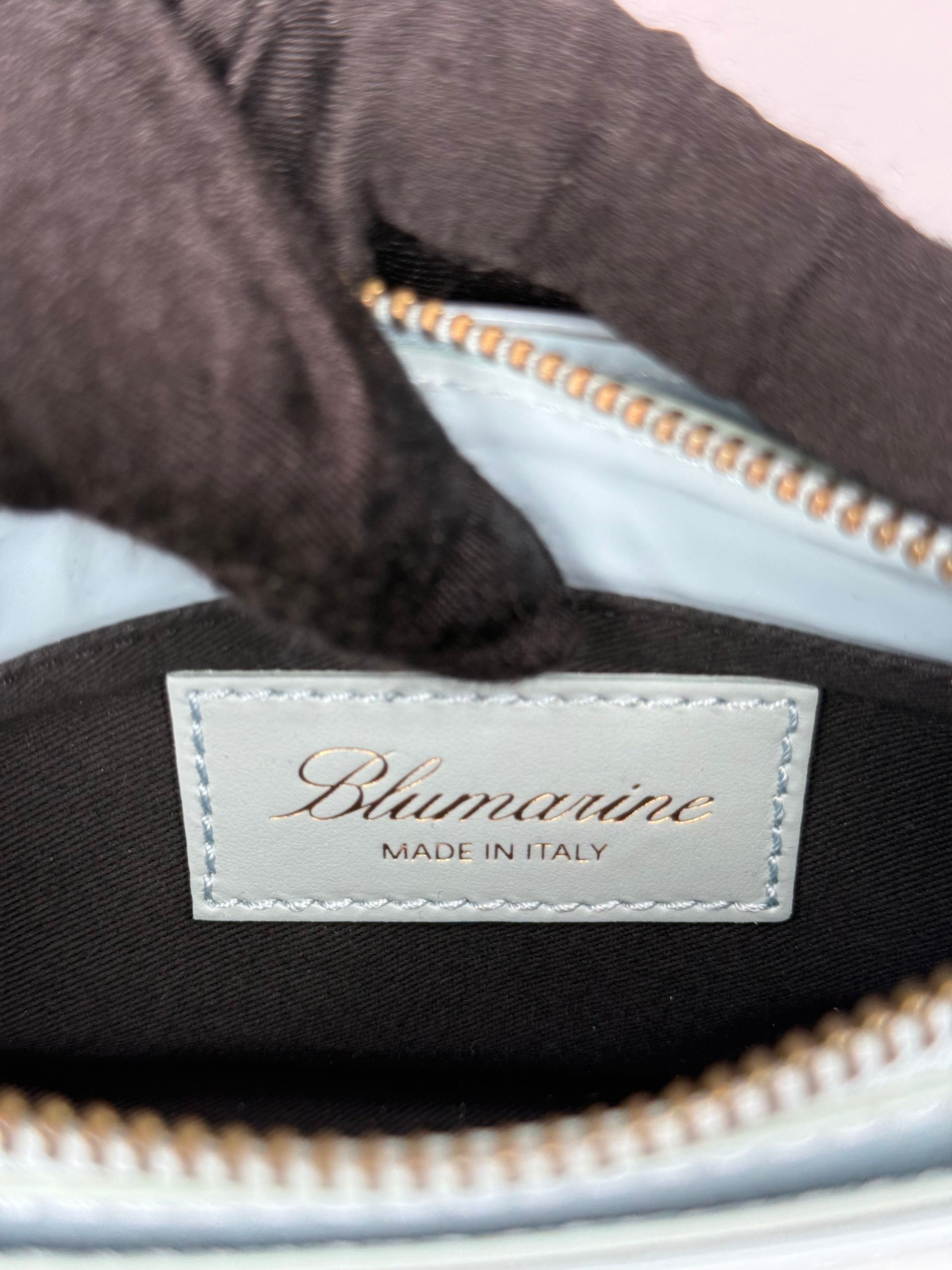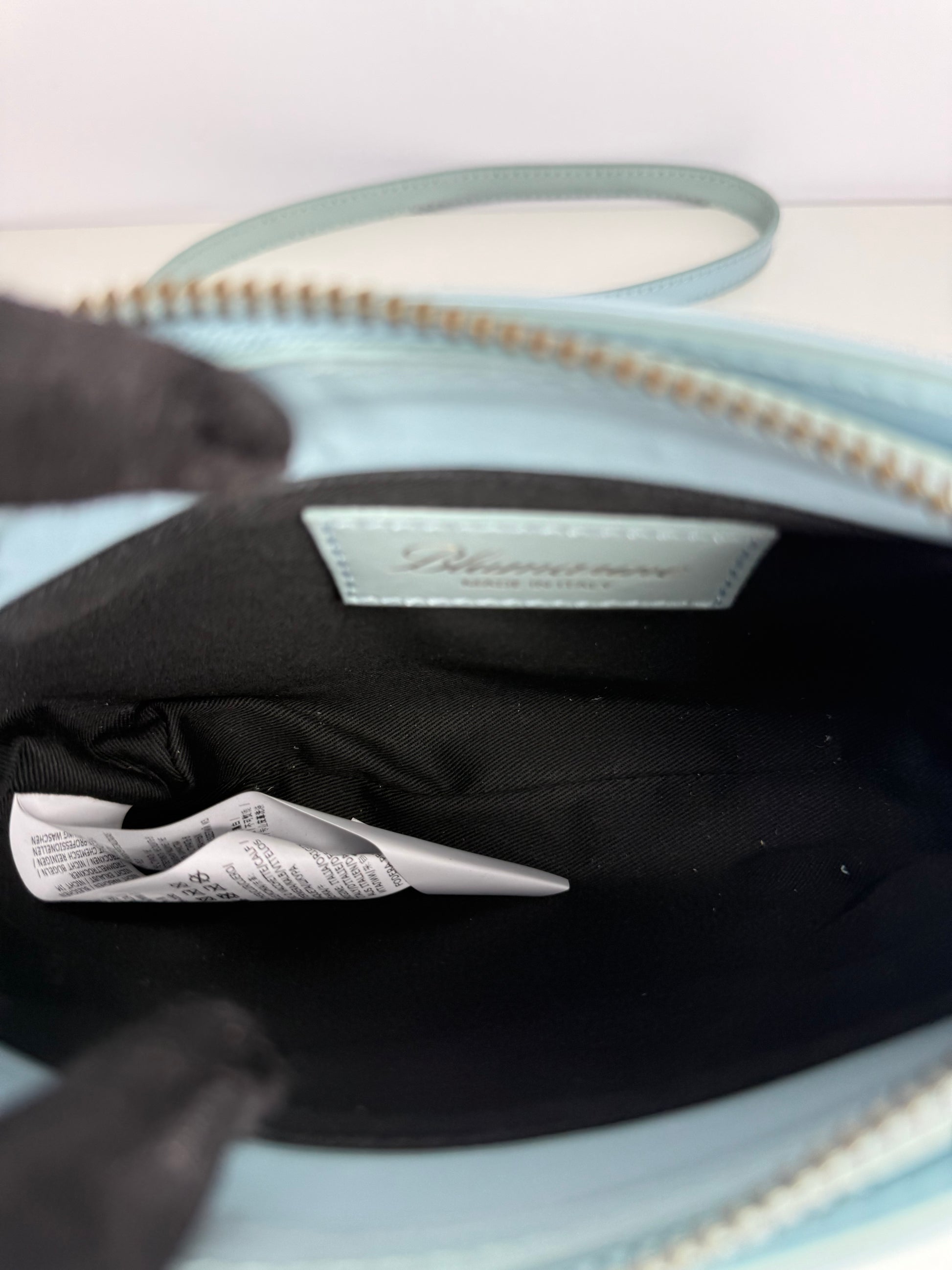 Blumarine Light Blue Patent Leather Crystal‑Logo Shoulder Bag
