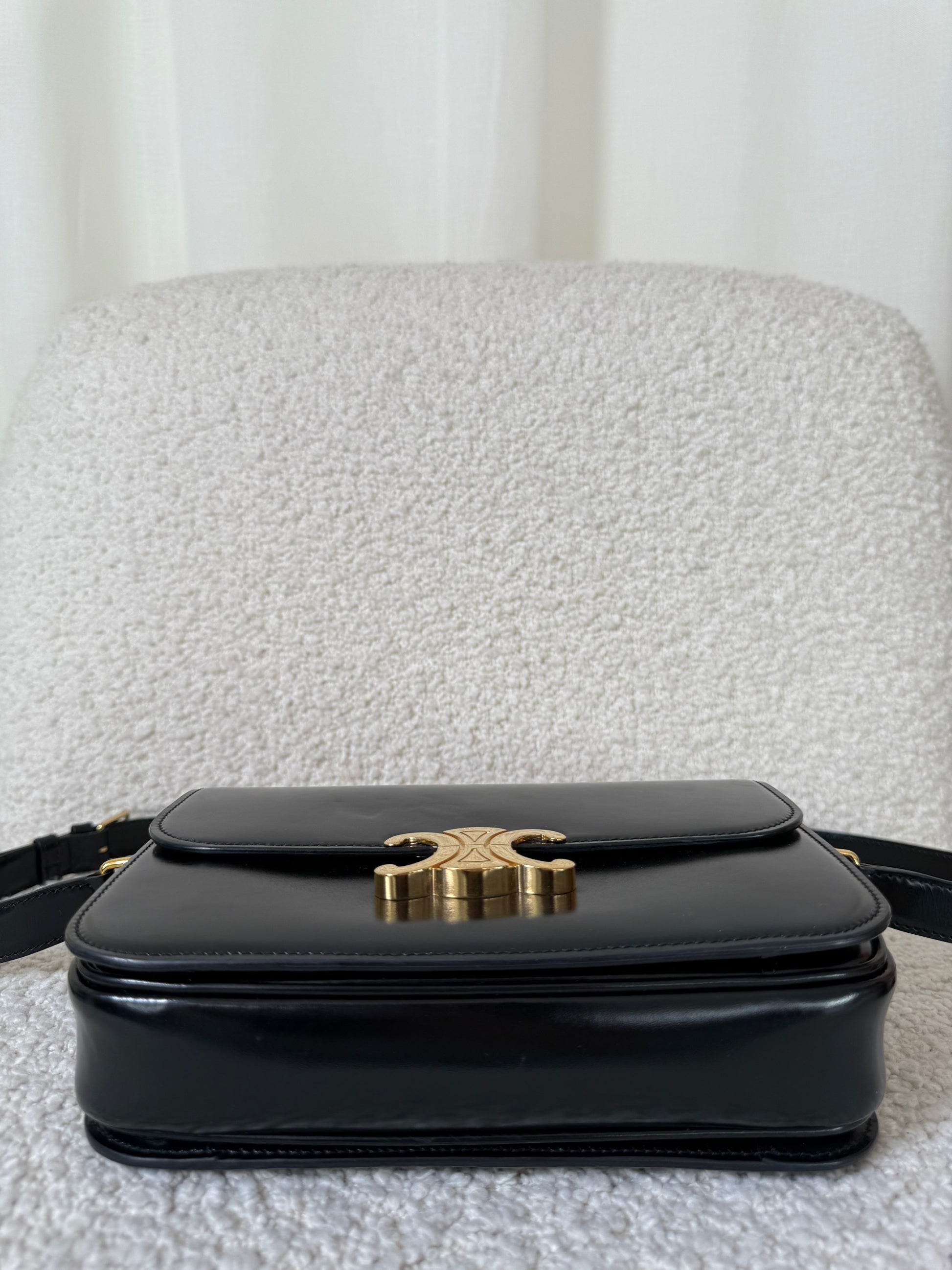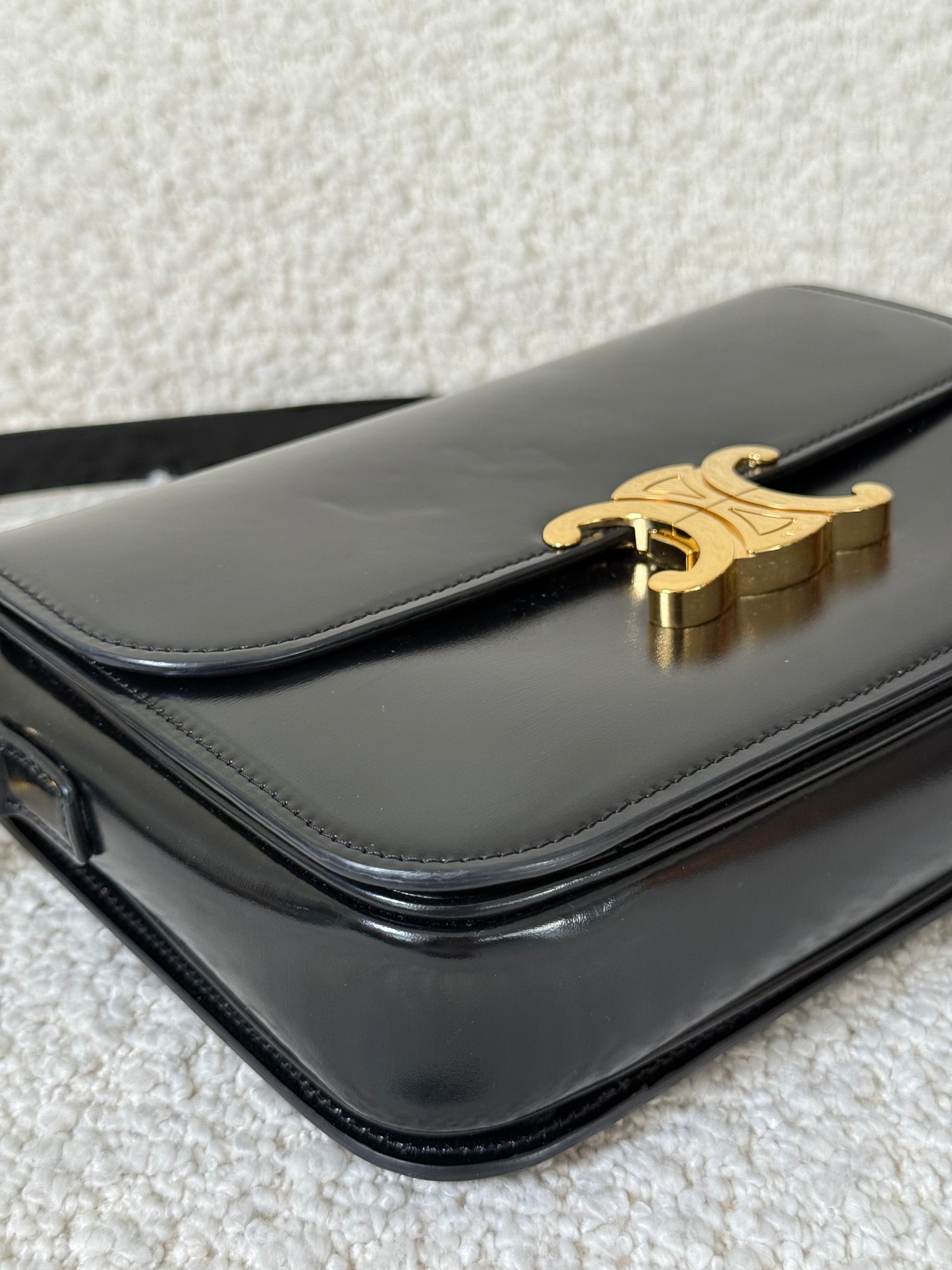 Sophisticated and sleek, the Celine Classique Triomphe Bag in black shiny calfskin features a structured silhouette accented by the signature gold-tone Triomphe clasp for a timeless finish.
