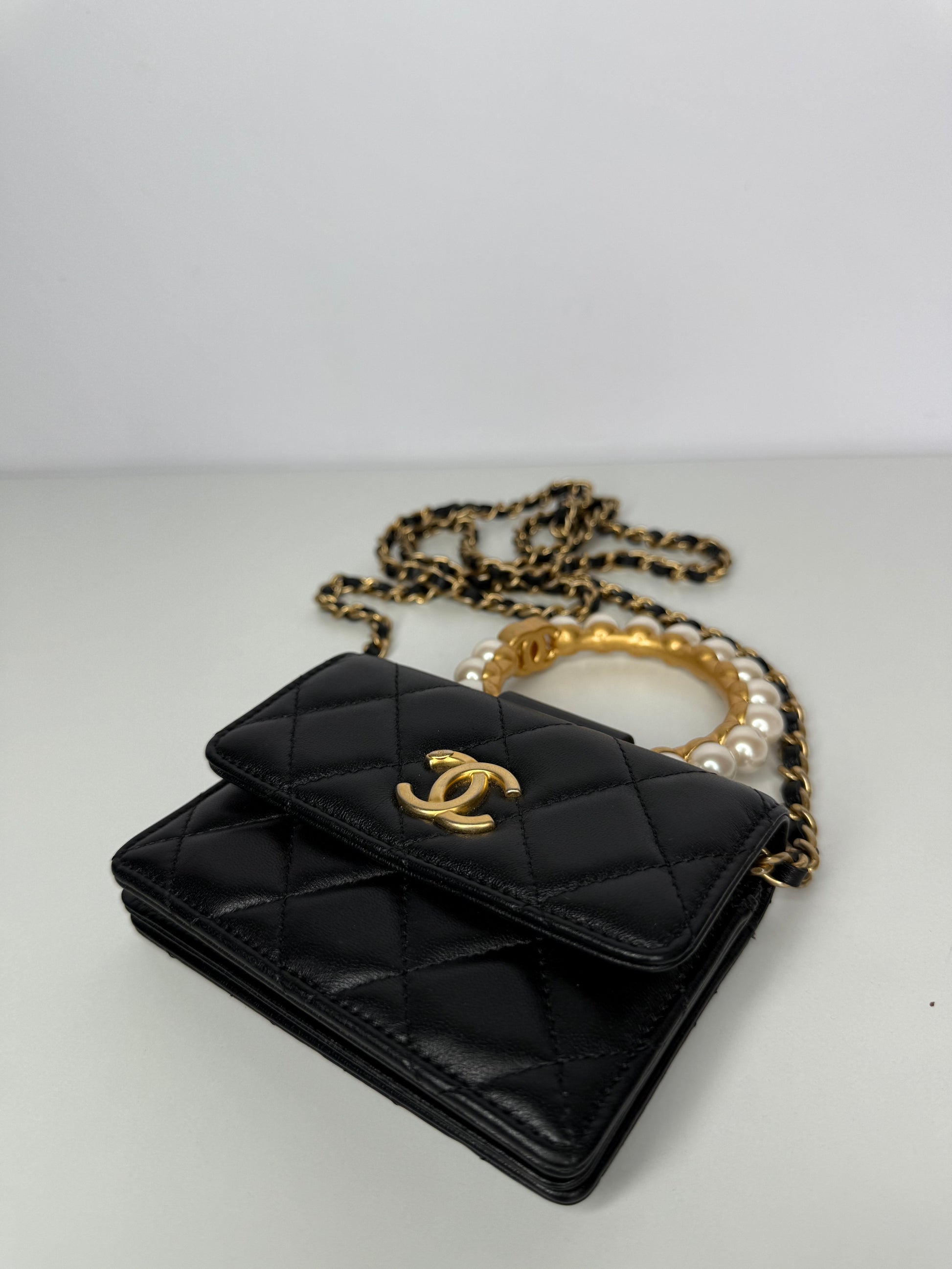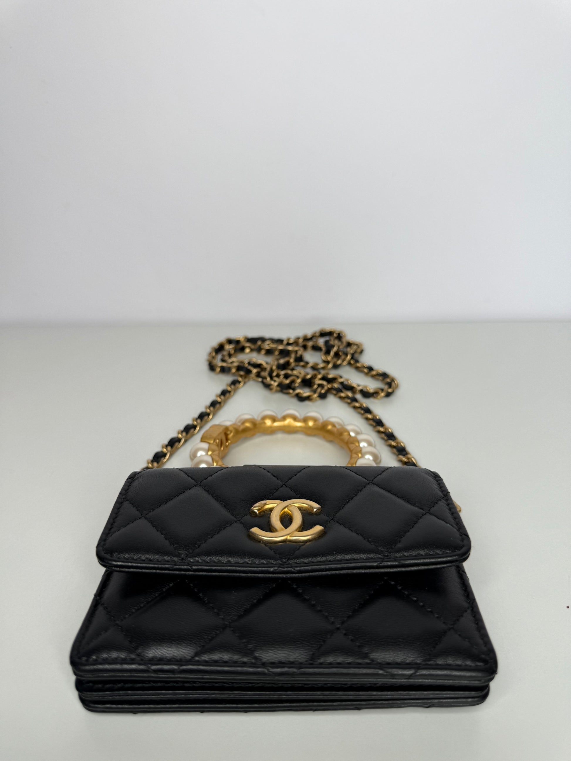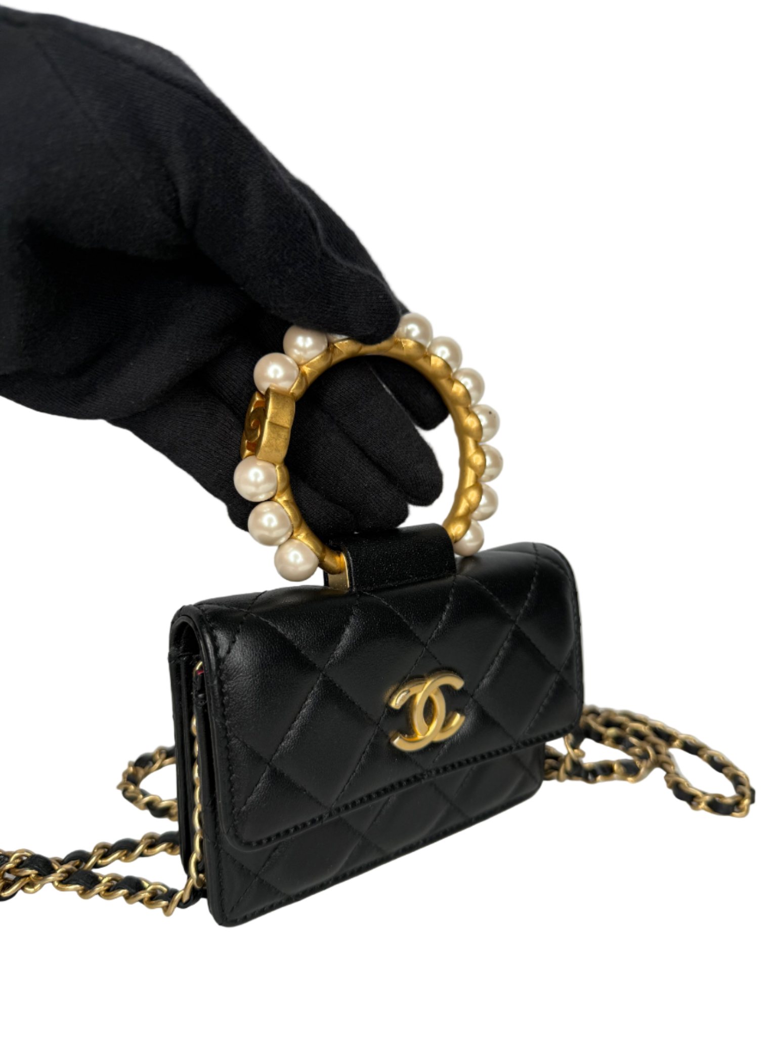 Chanel Black Quilted Lambskin Pearl Crown Clutch with Chain