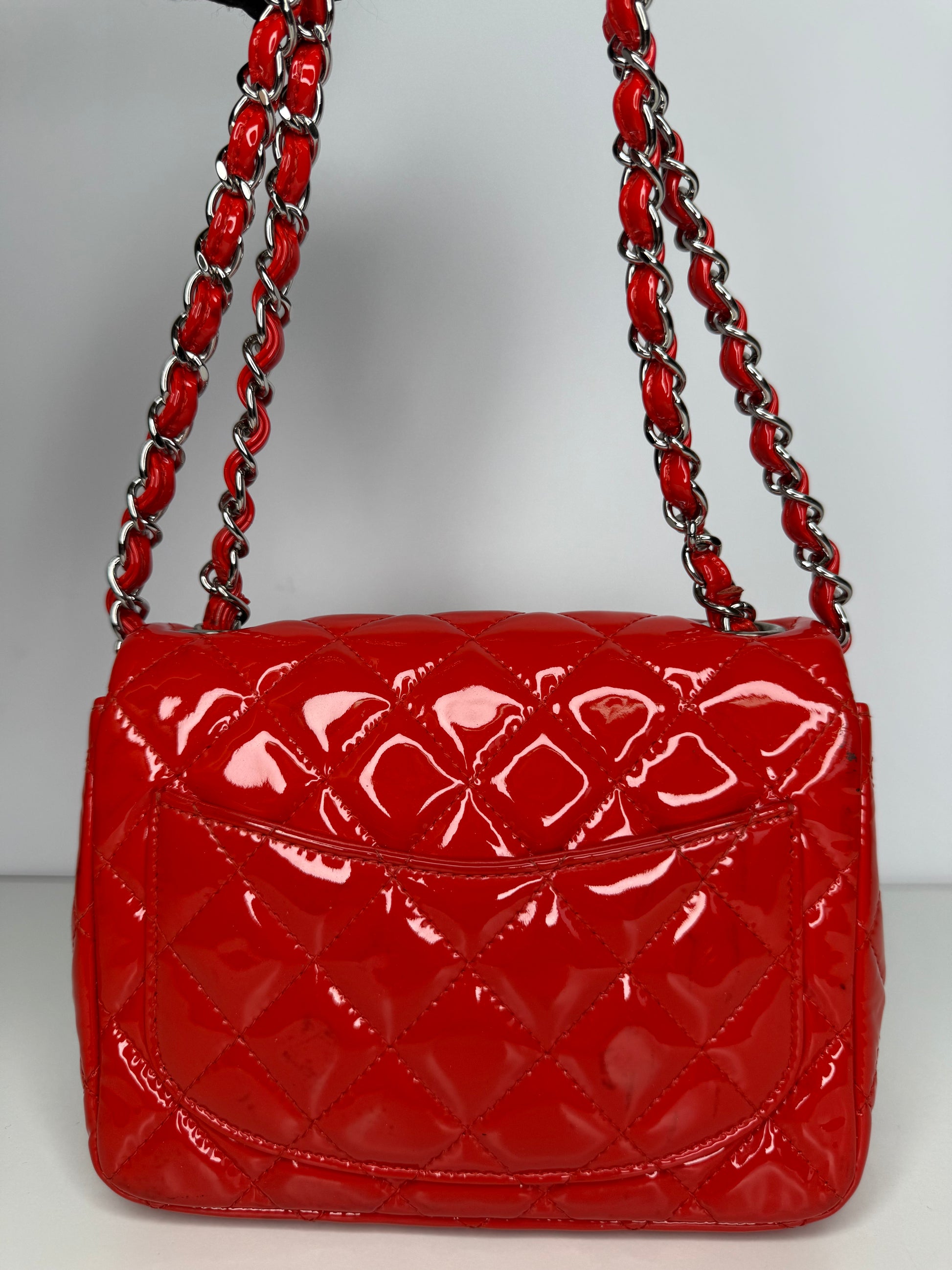 Chanel Classic Square Mini Flap Bag in red quilted patent leather, featuring a glossy finish, signature CC turn-lock, and timeless elegance in a compact silhouette.