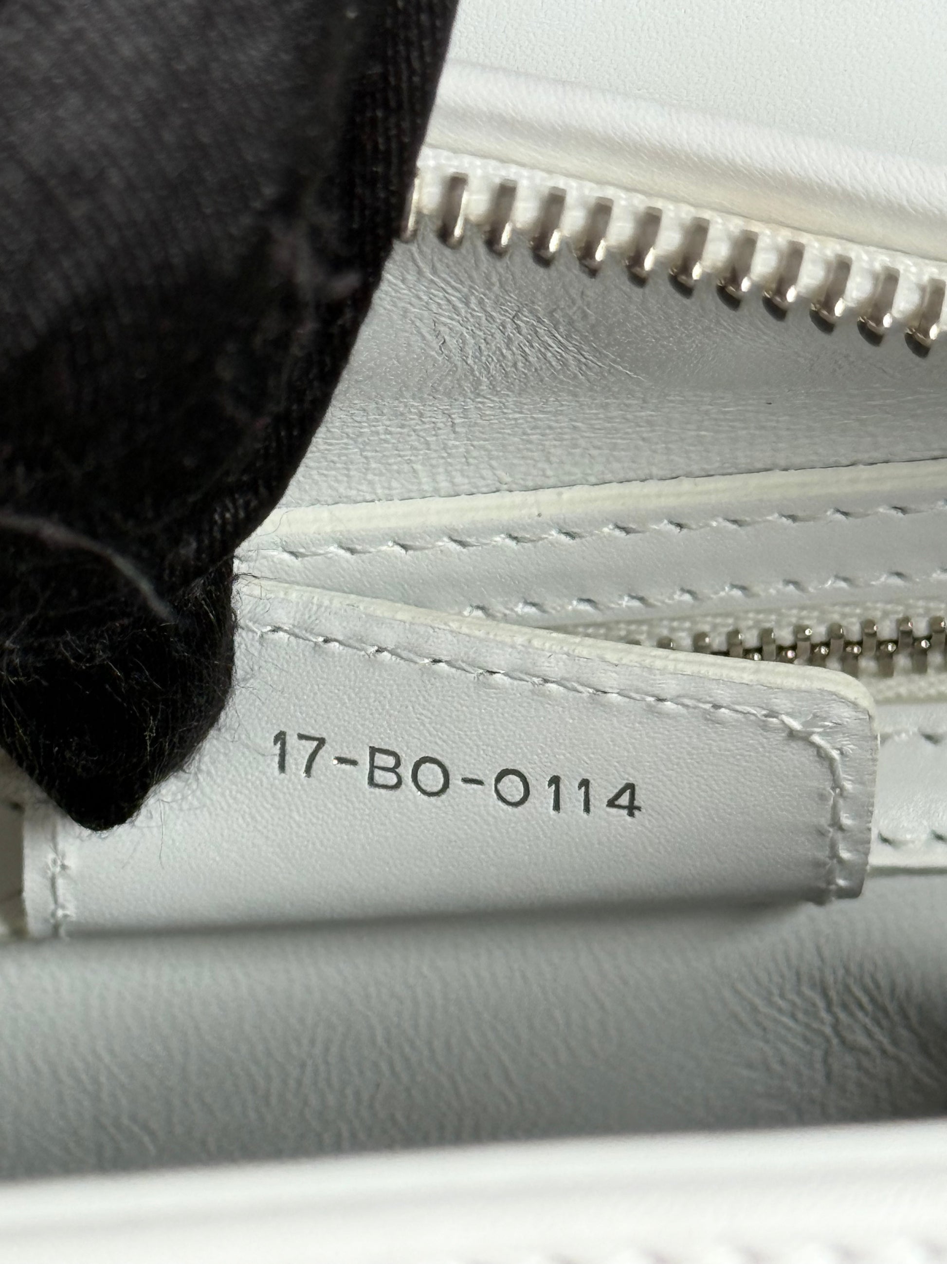The Christian Dior White Patch Embellished Medium Lady Dior is a refined statement piece crafted in smooth white leather, adorned with artistic patch embellishments. It features the iconic Cannage stitching, gold-tone 'D.I.O.R.' charms, and top handles, offering a bold twist on a timeless classic.