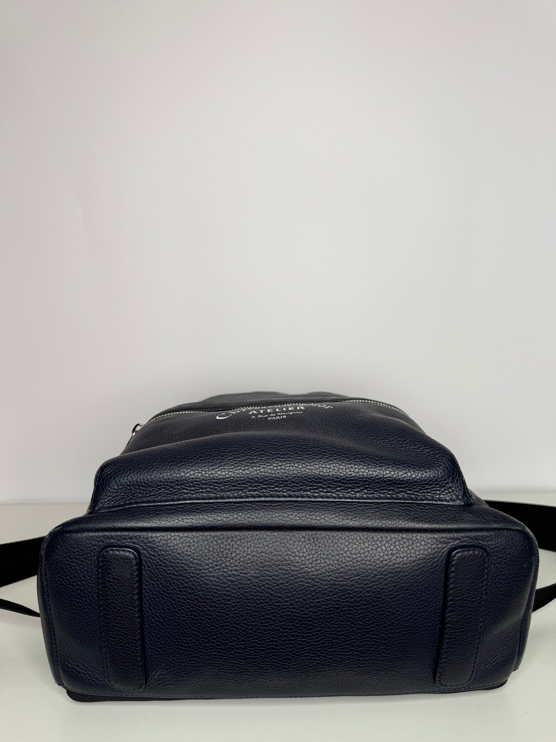 The Dior Homme Atelier Logo Leather Backpack in Navy Blue is a sleek, modern piece crafted from smooth leather with a minimalist design. It features the iconic Atelier logo embossed on the front, adjustable straps, and multiple compartments for functionality, blending style with practicality.