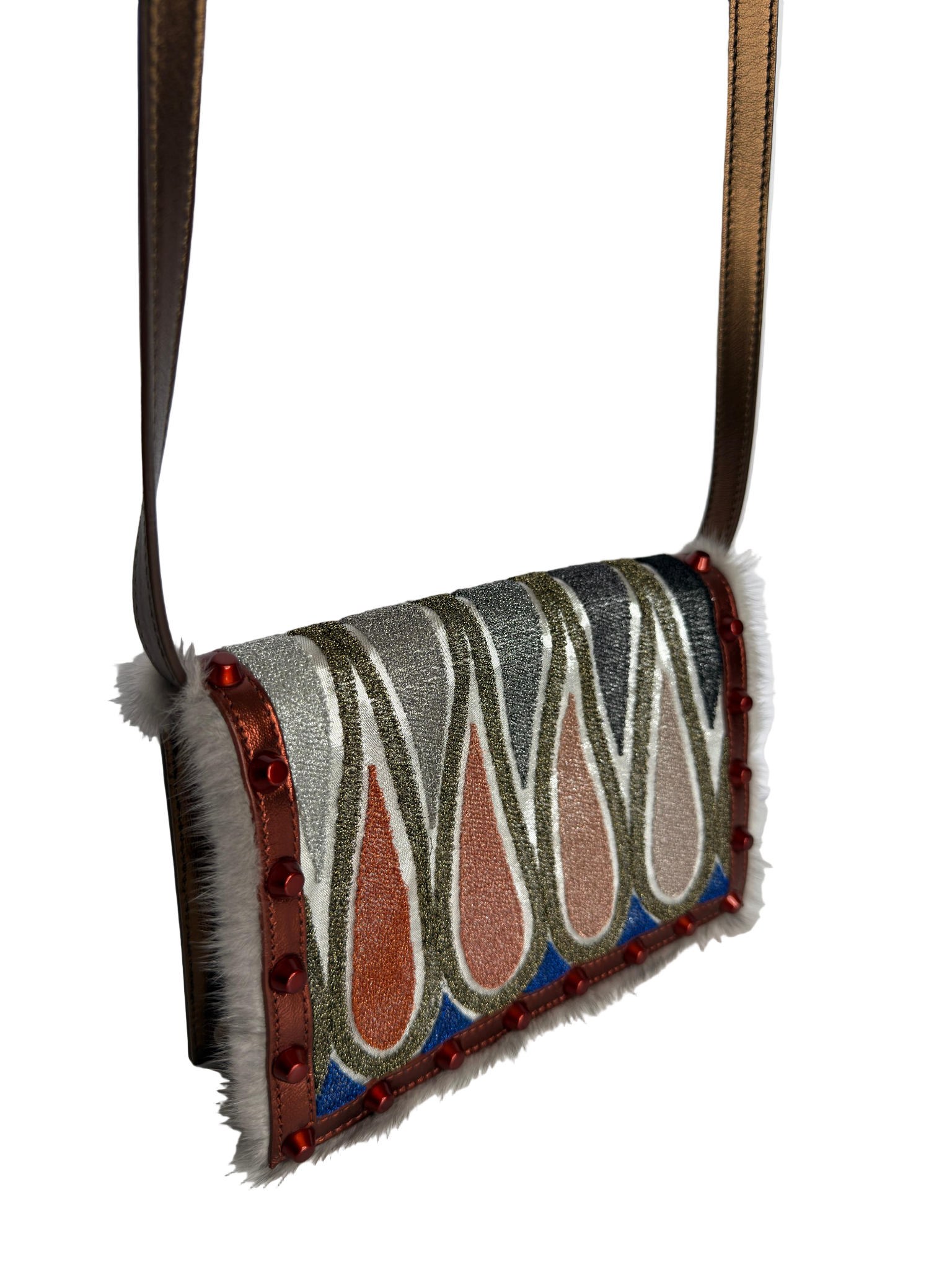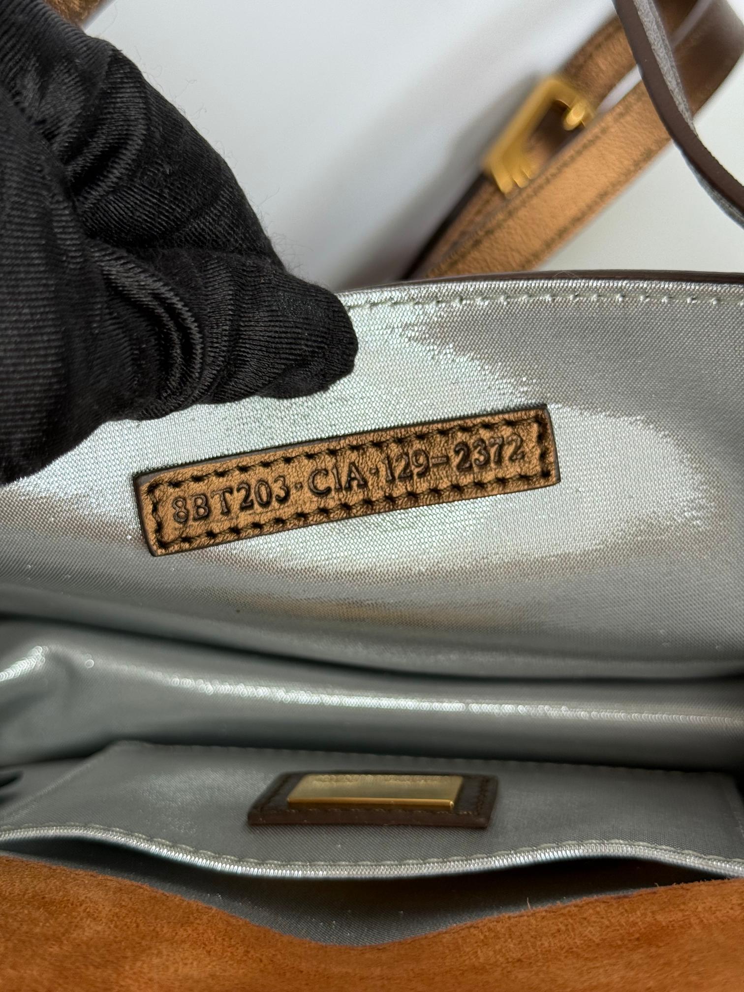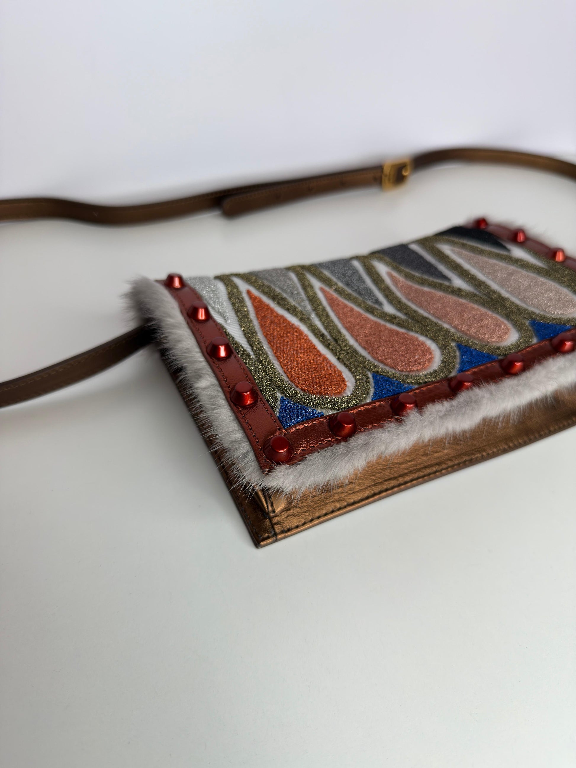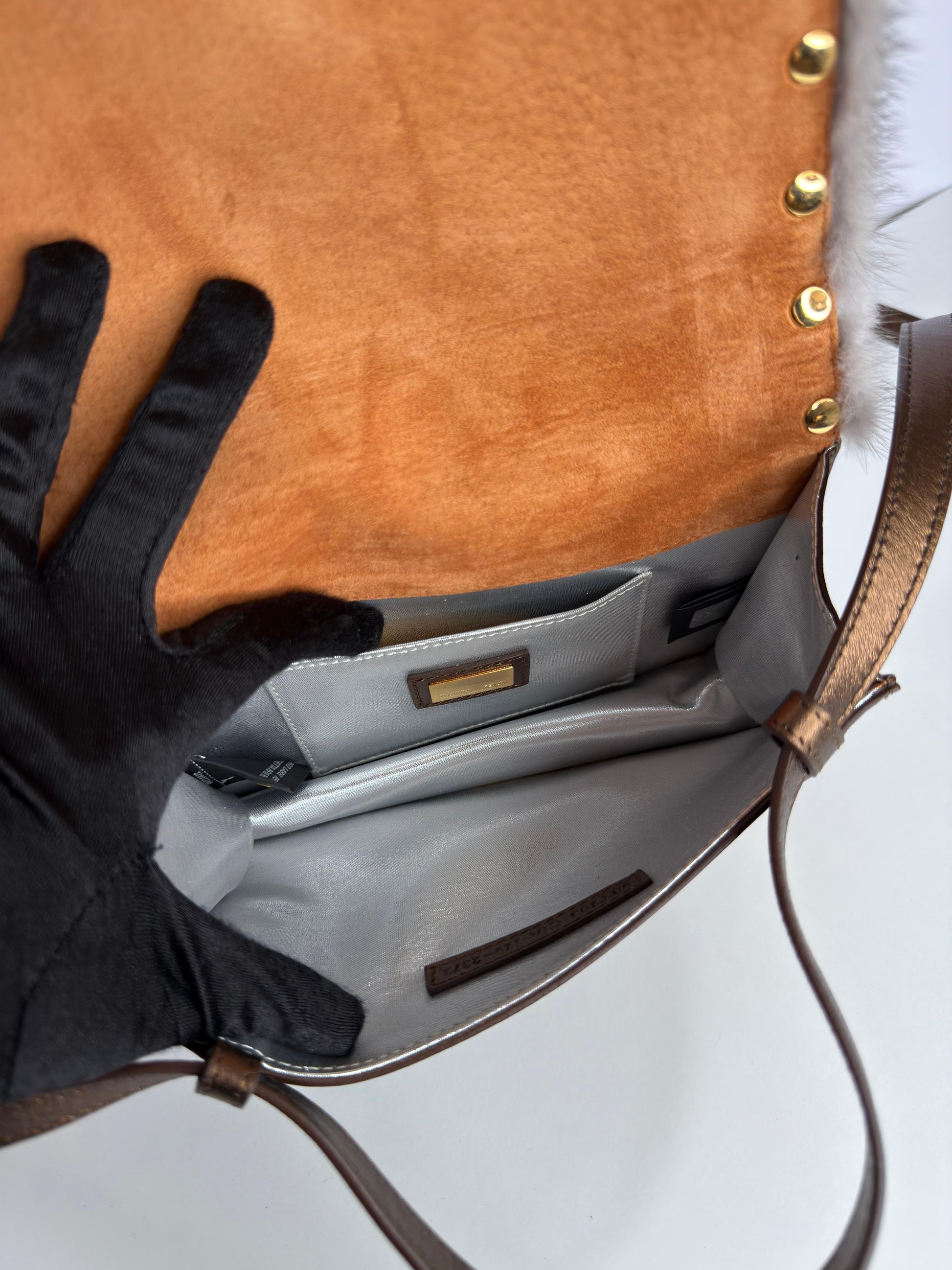 The Fendi Mink-Trimmed Dark Metallic Gold Crossbody Bag is a luxurious and eye-catching accessory. Crafted from shimmering metallic gold leather, it features plush mink fur trim and gold-tone hardware. With its compact size and adjustable strap, this bag combines opulence with everyday functionality.
