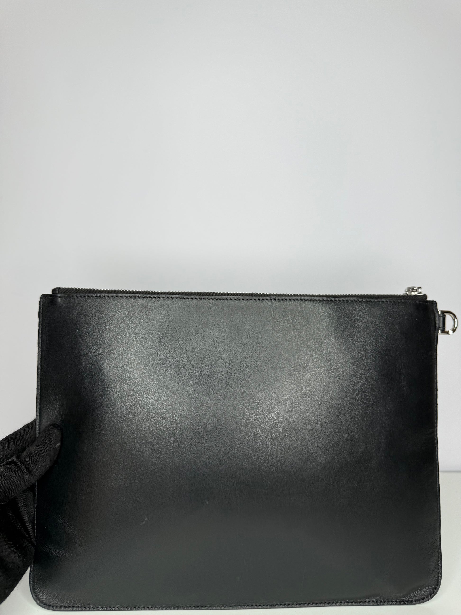 The Givenchy Black Leather Studded Zip Pouch is a sleek and edgy accessory crafted from smooth black leather. It features a zip closure and is adorned with silver-tone studs, adding a touch of boldness to its minimalist design. The pouch is perfect for carrying essentials like cards, cash, or cosmetics, making it a versatile addition to any outfit. Its compact size ensures easy portability, while the studded detailing offers a contemporary edge.