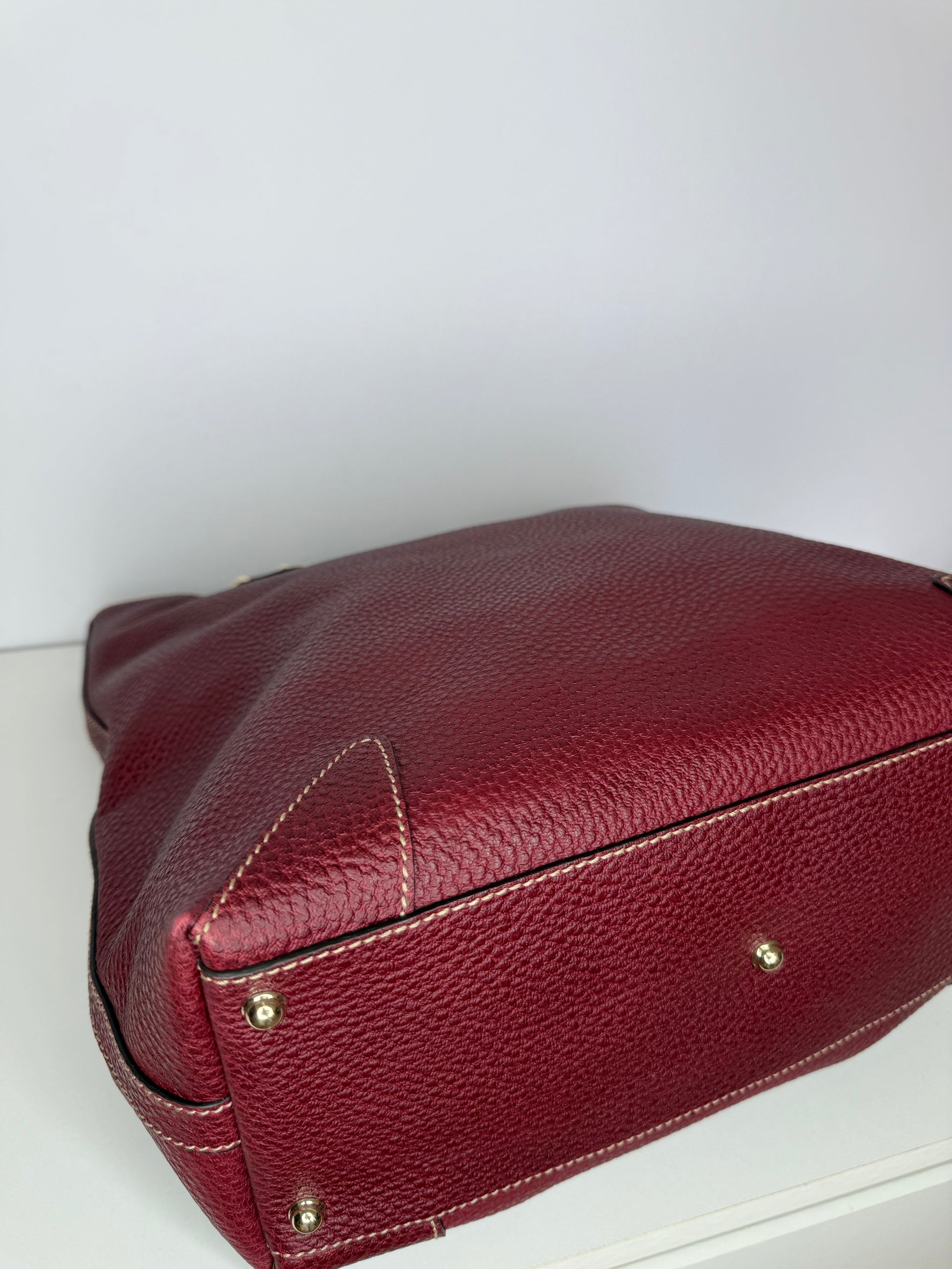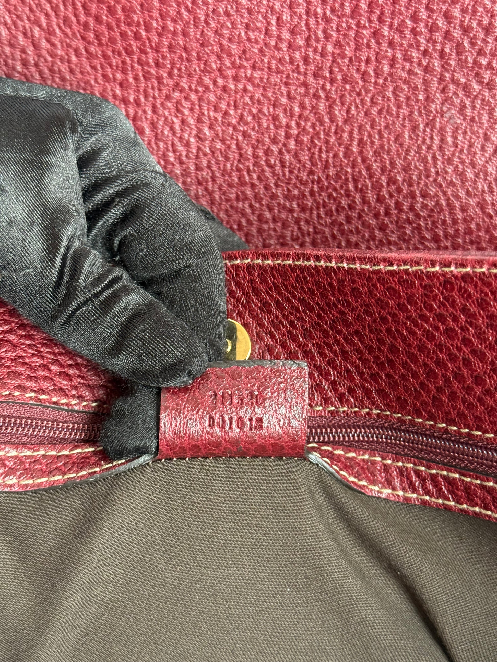 The Gucci Burgundy Leather Weekend Tote Bag features rich burgundy leather in a spacious, durable design—perfect for stylish travel or weekend getaways.