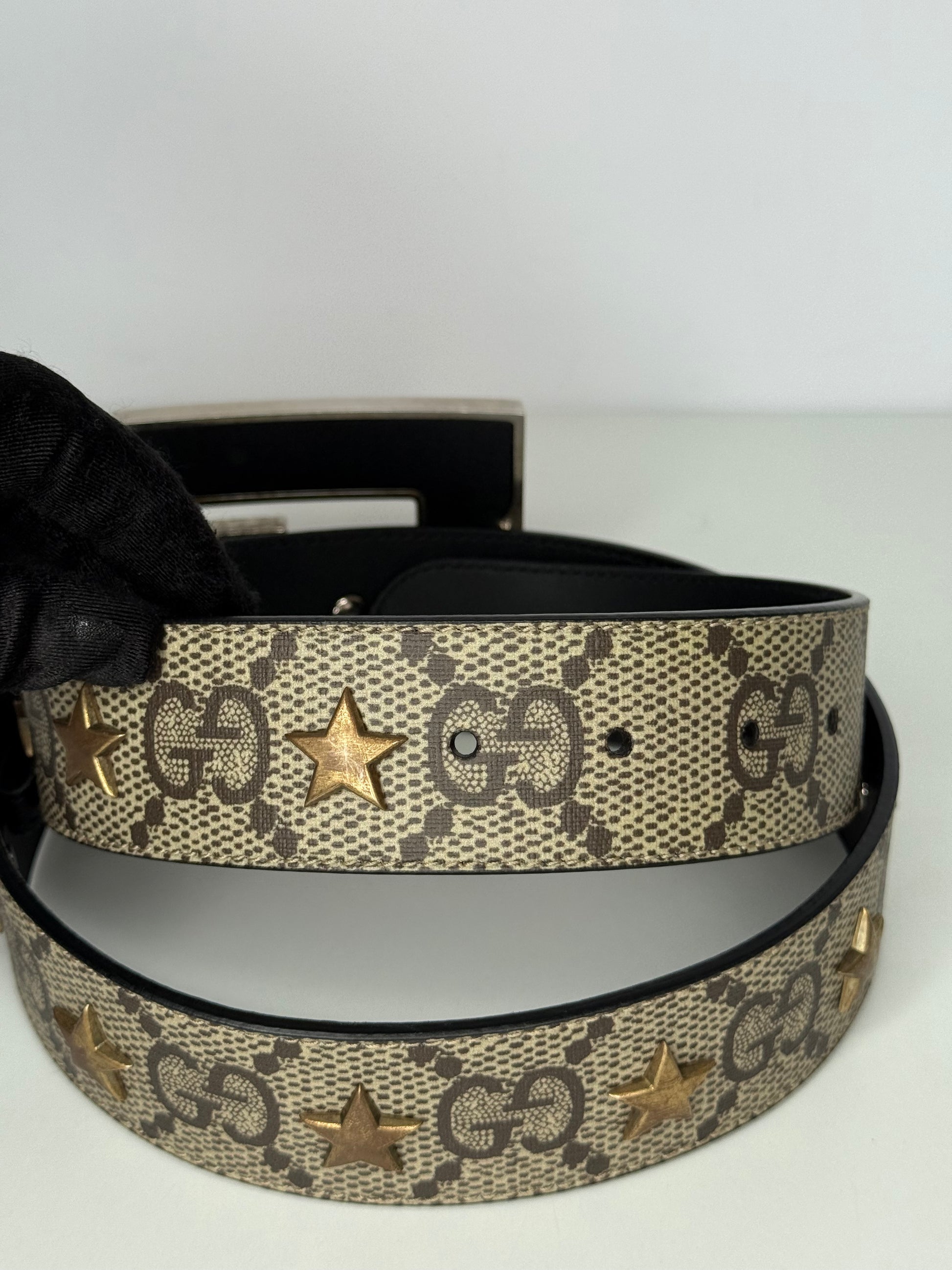 The Gucci Star Wide Belt with Square G in Beige GG Supreme Canvas is a bold accessory that combines the brand's iconic GG pattern with star motifs. It features a wide silhouette and a square G buckle, adding a distinctive touch to any outfit. This belt offers a modern twist on a classic design, making it a standout piece in Gucci's collection.