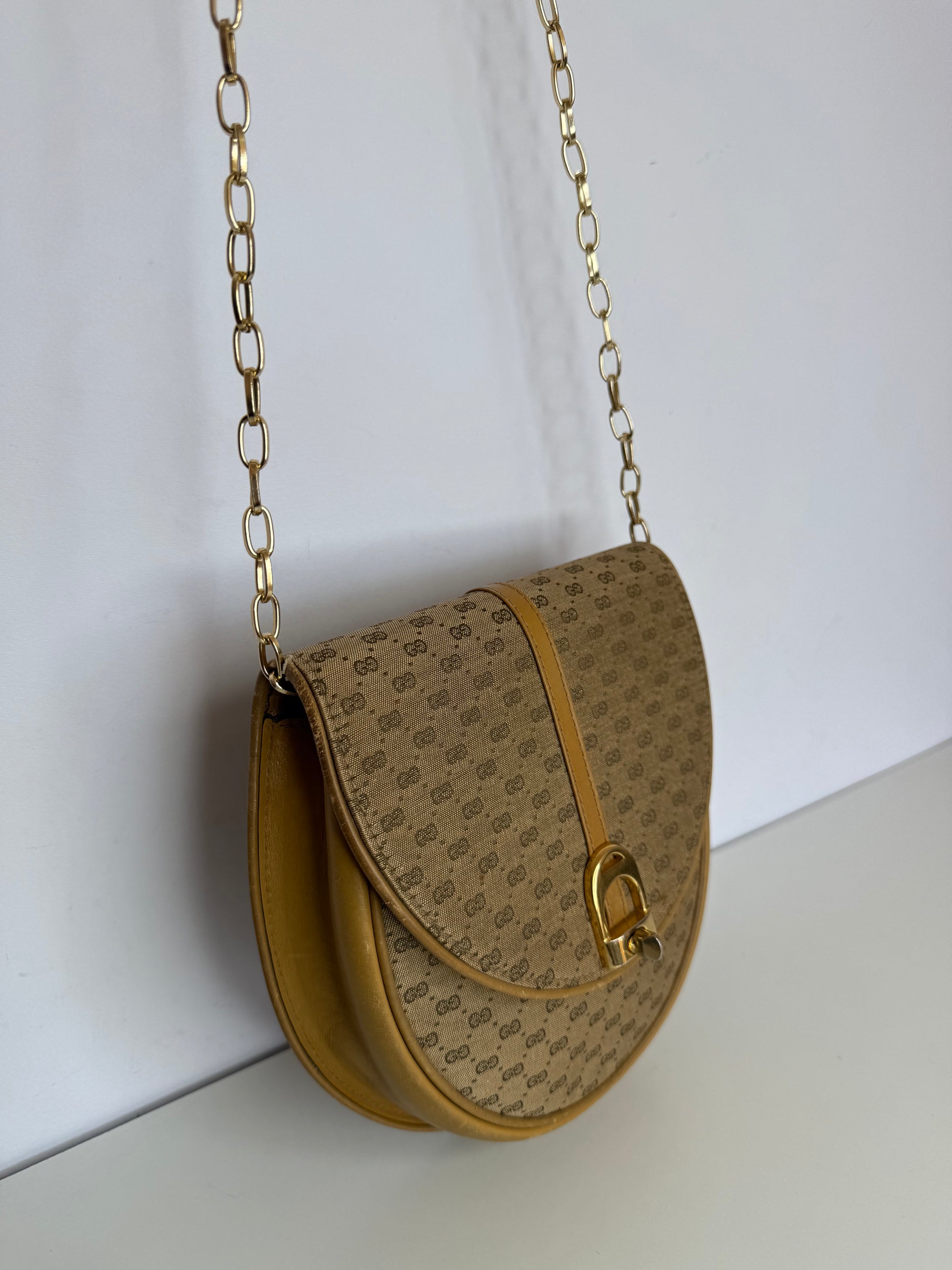The Gucci Vintage Brown Micro GG Canvas Crossbody Bag features the iconic GG monogram in a compact, crossbody design, offering a blend of timeless style and practicality.