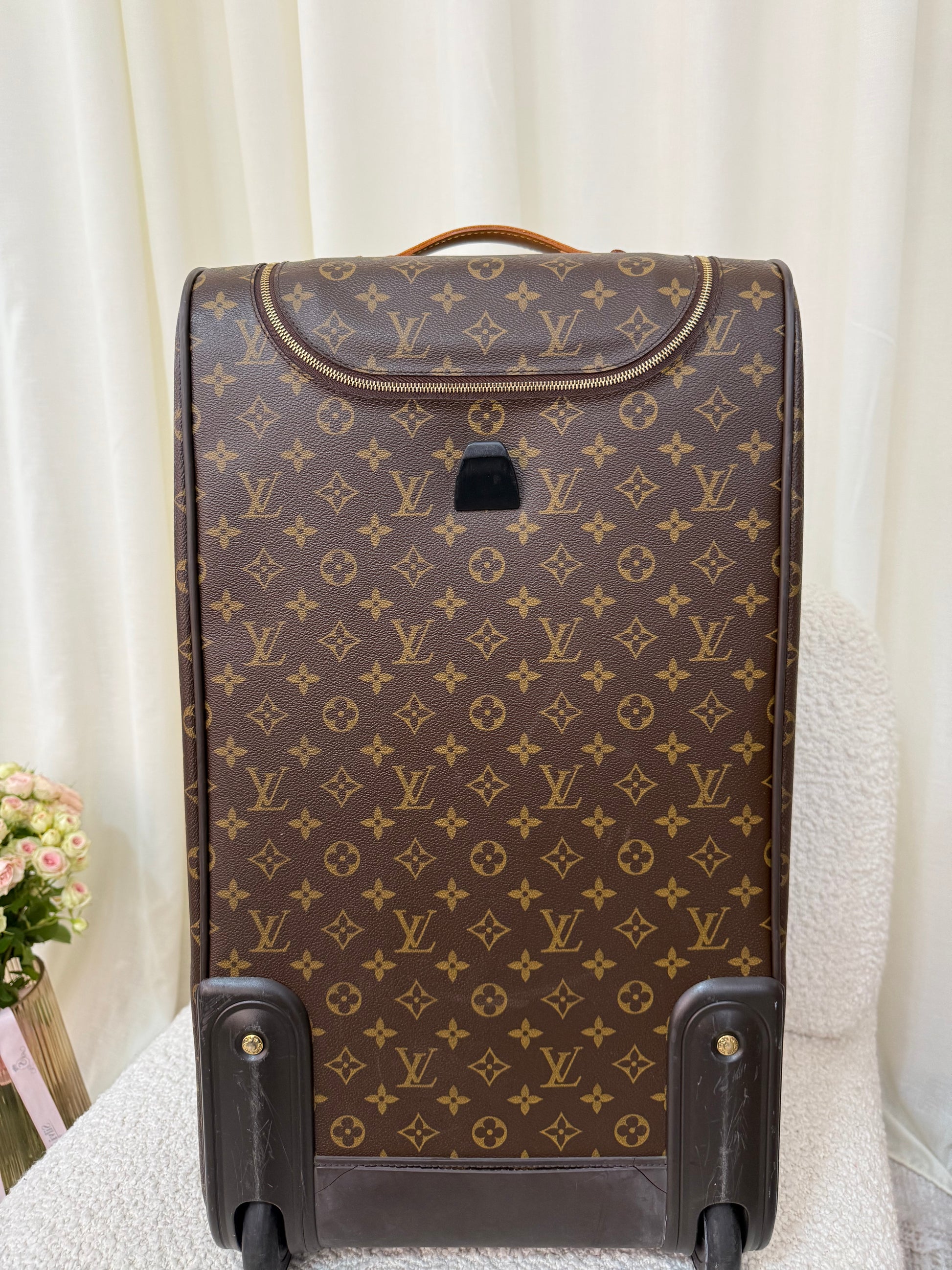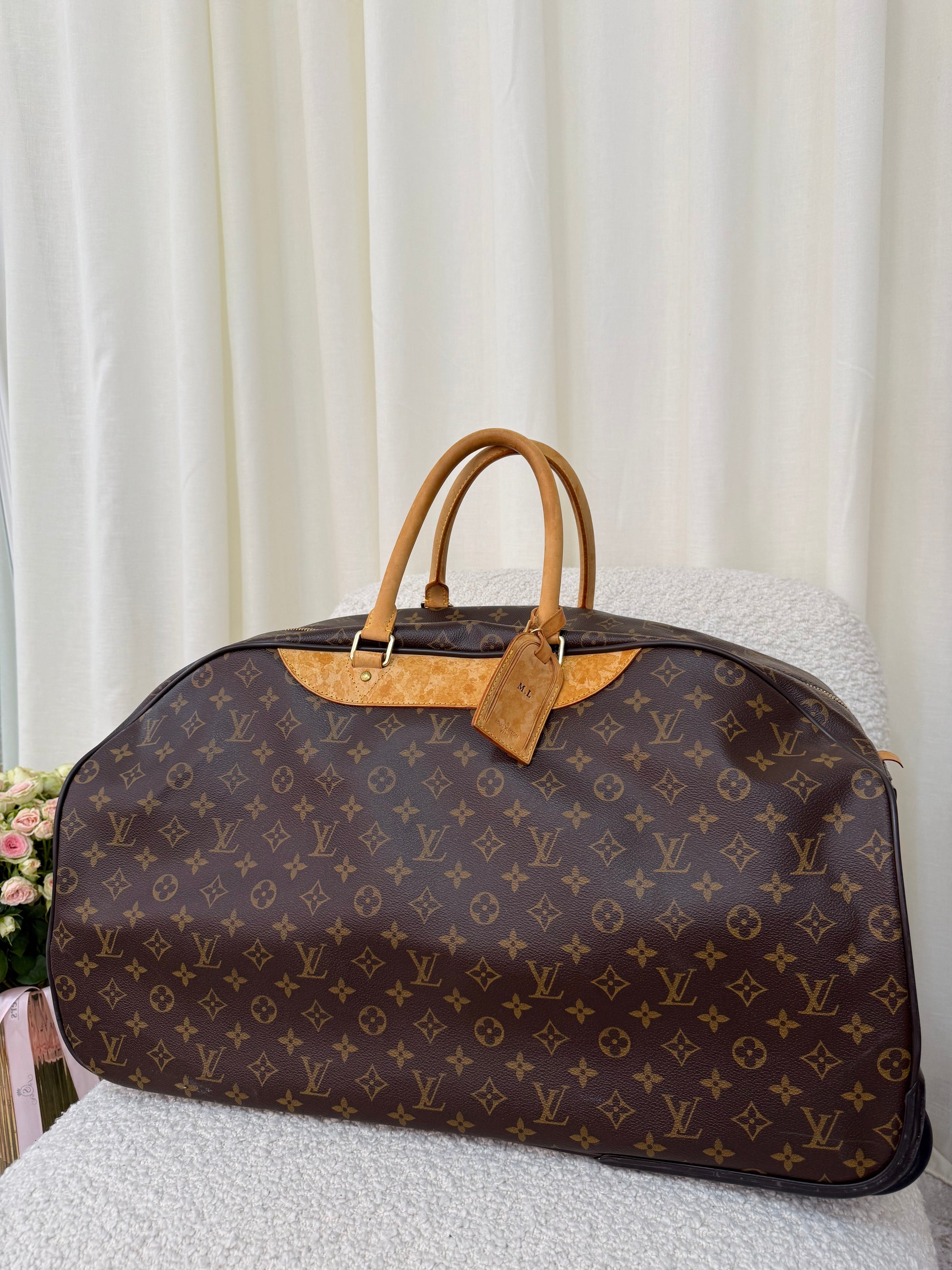 Louis Vuitton Eole 60 travel bag in Monogram canvas, combining elegance and practicality. Features a spacious interior, rolling wheels, and leather handles for effortless travel in signature LV style.